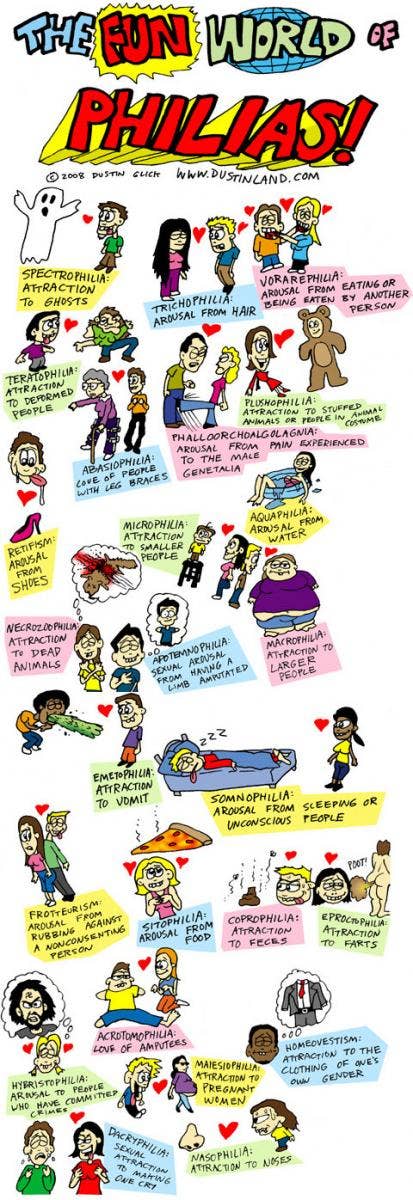 Need examples? Fortunately, cartoonist Dustin Glick put together an amazing illustrated diagram that breaks down 25 eye-opening philias, including microphilia (an attraction to little people) and 24 other extraordinarily kinky sexual proclivities.