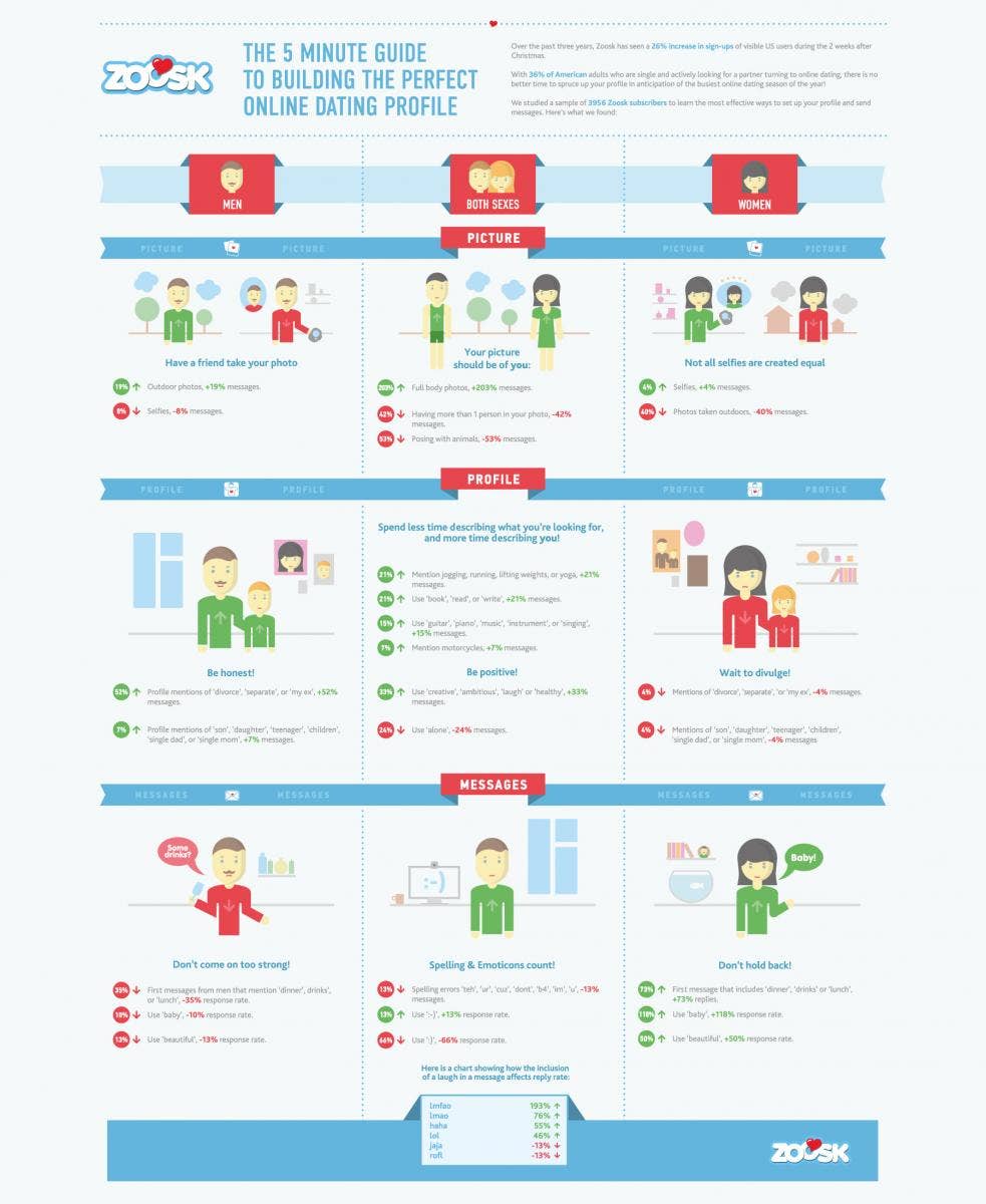 Where should you take your photo? Should you mention your baggage? Is using slang okay? Finally, your questions have been answered, thanks to a study of more than 4,000 online daters by Zoosk.com. There is now a recipe you can follow to find love — and emoji-lovers, you're in luck.