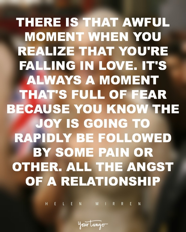 "There is that awful moment when you realize that you're falling in love. That should be the most joyful moment, and actually it's not. It's always a moment that's full of fear because you know, as night follows day, the joy is going to rapidly be followed by some pain or other. All the angst of a relationship." — Helen Mirren