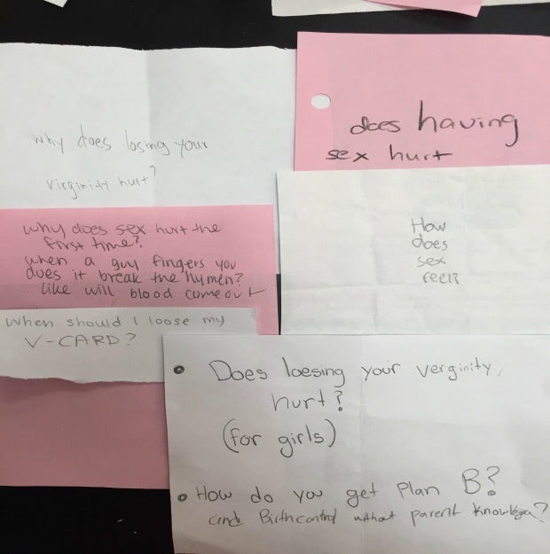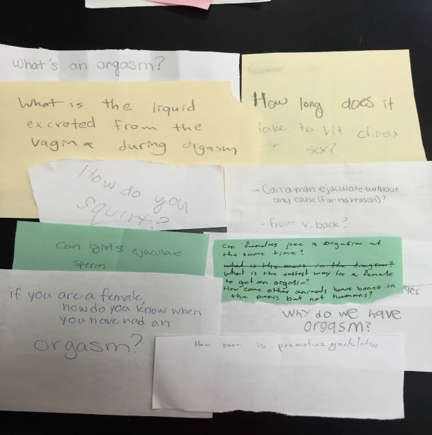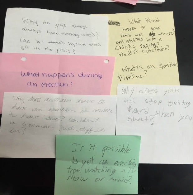 It looks like one teacher decided to find out by letting students anonymously turn in their biggest questions about sex. That person then posted pictures of the questions on Reddit.