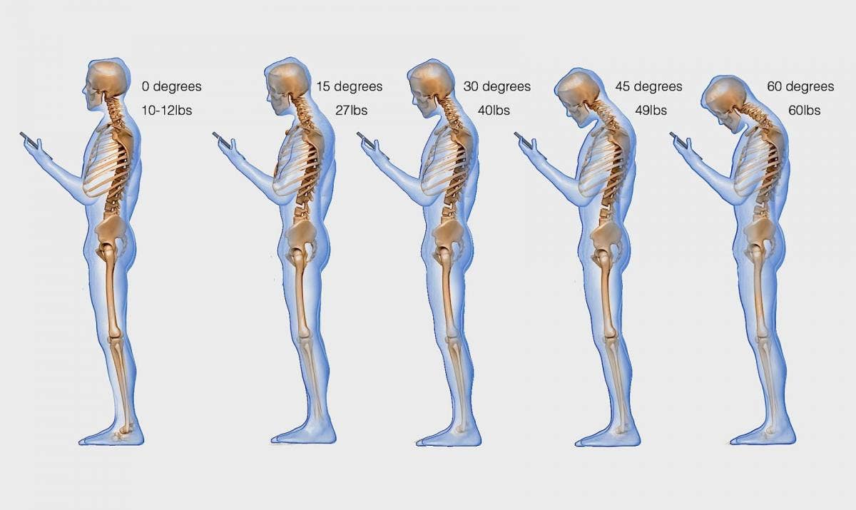 In the study, Dr. Hansraj says, "The weight seen by the spine dramatically increases when flexing the head forward at varying degrees. Loss of the natural curve of the cervical spine leads to incrementally increased stresses about the cervical spine. These stresses may lead to early wear, tear, degeneration, and possibly surgeries."