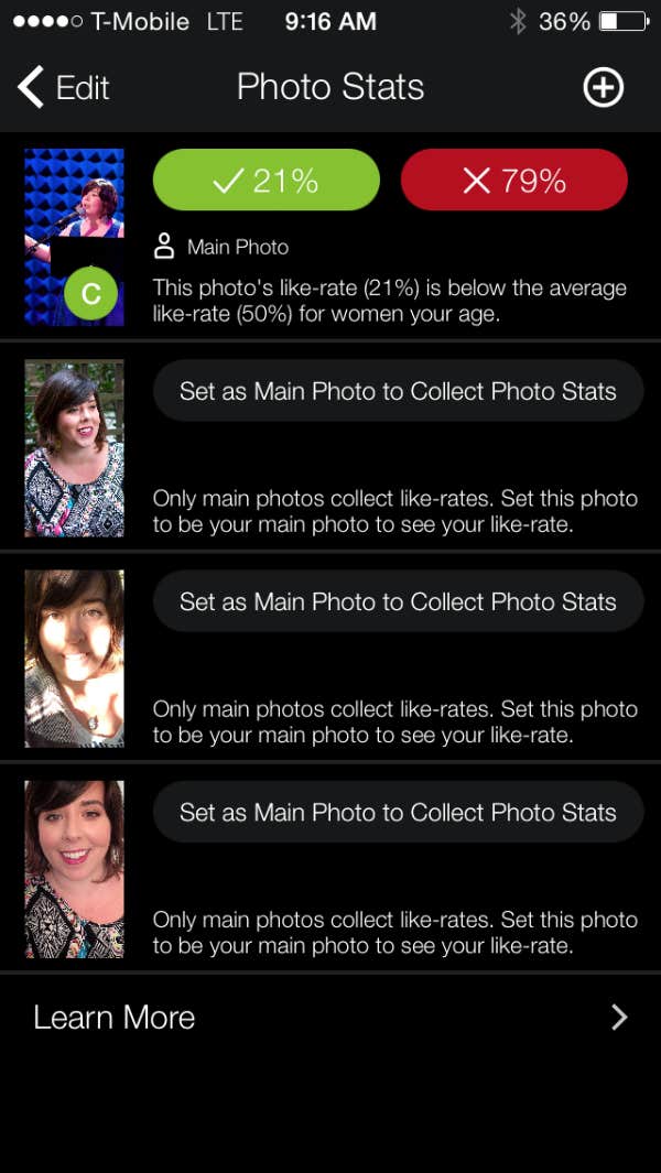 The naturally posed photo with the same makeup got a 42 percent like rate (second photo from top, above), which is an improvement. But you'll notice that a photo of me wearing no makeup at all (first photo, above), posing outdoors in the sun like the hippie I am, got a 43 percent like rate.