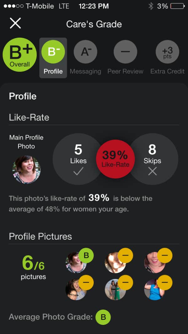 Because The Grade, like Tinder, is connected to Facebook, the photo I was using as my Facebook profile — not the photo with makeup done by Lauren — automatically populated as my first profile picture on The Grade. That photo didn't do so well.
