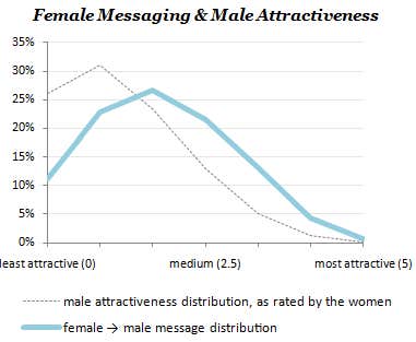 With basic ratings so off-kilter, the two curves suggests some unique interpretations of the female thought process. The most striking one is that the average-looking female believes that most men aren't hot enough for her, but she decides to message them anyway.
