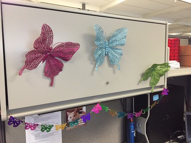 She got in and found that a couple of them had decorated her cubicle to surprise her: