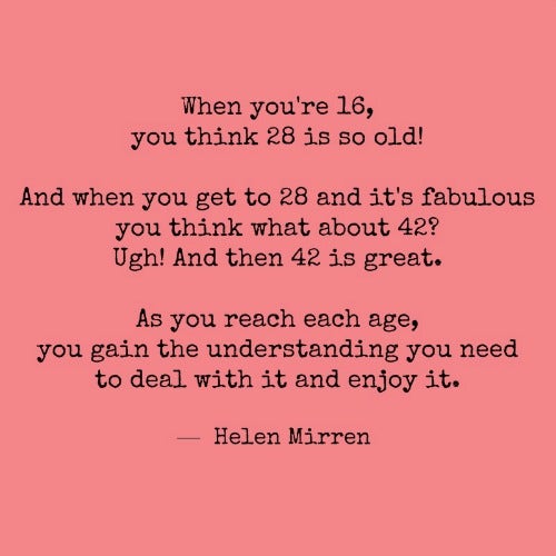 13. "When you're 16, you think 28 is so old! And when you get to 28 and it's fabulous you think what about 42? Ugh! And then 42 is great. As you reach each age, you gain the understanding you need to deal with it and enjoy it." —Helen Mirren