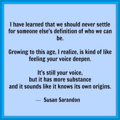 15. "I have learned that we should never settle for someone else's definition of who we can be. Growing to this age, I realize, is kind of like feeling your voice deepen. It's still your voice, but it has more substance and it sounds like it knows its own origins." —Susan Sarandon