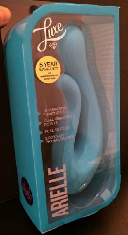 Arielle is from the Luxe product line made by Blush Novelties. It is pure silicone (with an ABS plastic battery cap), splash proof and battery-operated (2 x AAA). The large arm has an insertable length of 4.75 inches and is 1-inch wide. The smaller arm is 3 inches long. It has two different buttons — one is to turn on and off the power, while the second button changes the vibration setting.