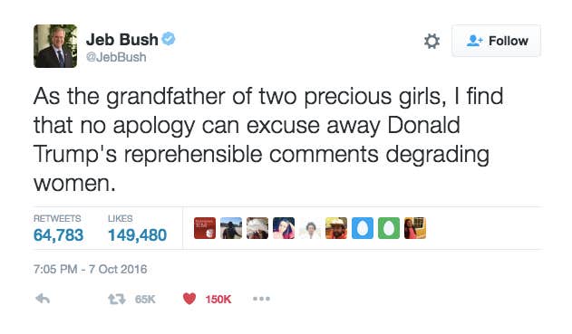 Former presidential candidate Jeb Bush said, "As the grandfather of two precious girls, I find that no apology can excuse away Donald Trump's reprehensible comments degrading women."
