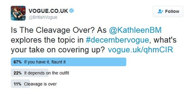 WeHeartItEarlier this week, Vogue UK teased an article in their December issue titled "Desperately Seeking Cleavage,” in which the editors suggested that cleavage is currently “over.” Writer Kathleen Baird-Murray went even further, saying, that in terms of fashion, “The tits will not be out for the lads. Or for anyone else, for that matter.”