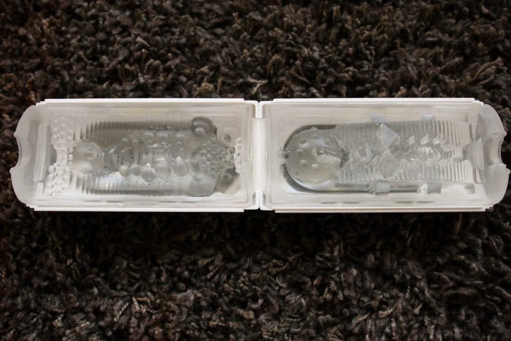 After warming up the plastic with water (over the sink), shake off the excess water and begin adding lube to it. You want to cover the entire inside (of both sides) with a water-based lubricant. While you aren't looking to be so extravagant that you empty half a bottle into it, you do want to make sure that you cover every nook and cranny in there by smearing it around with your fingers.