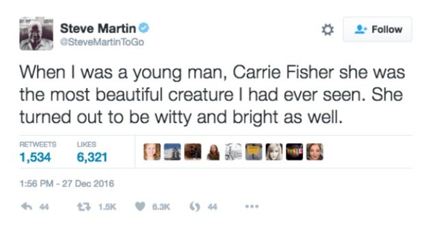 weheartitAs many people now know, Steve Martin was recently taken to task for his tribute Tweet upon Carrie Fisher's passing.