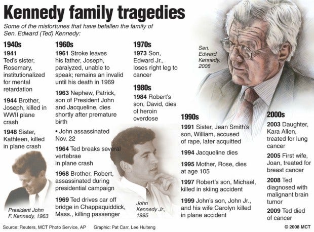 Here is the timeline of tragic events that fall under the legend under of the Kennedy curse: