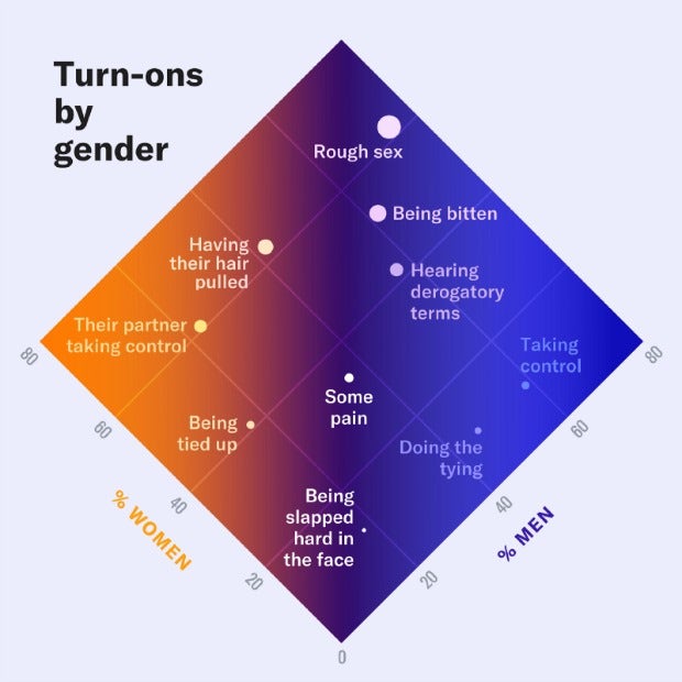 "When we asked about 'Would you rather ... 64% of men and 51% of women said they either wanted to 'be tied up during sex,' 'do the tying,' or 'sometimes be tied up, sometimes do the tying.' The rest said 'avoid bondage altogether' or skipped the question."