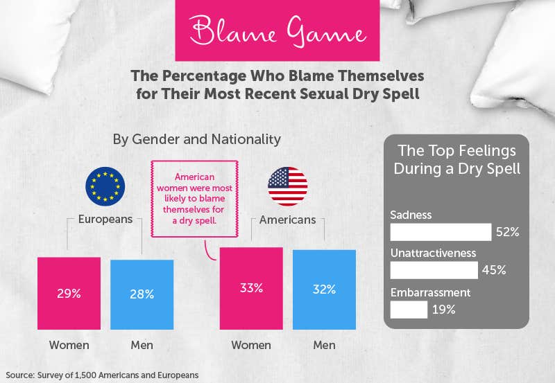 The study found that American and European women were more likely to blame themselves for a sexual dry spell than men. More than half of the participants expressed that they were sad about the lack of sex and a third said that they were feeling unattractive.