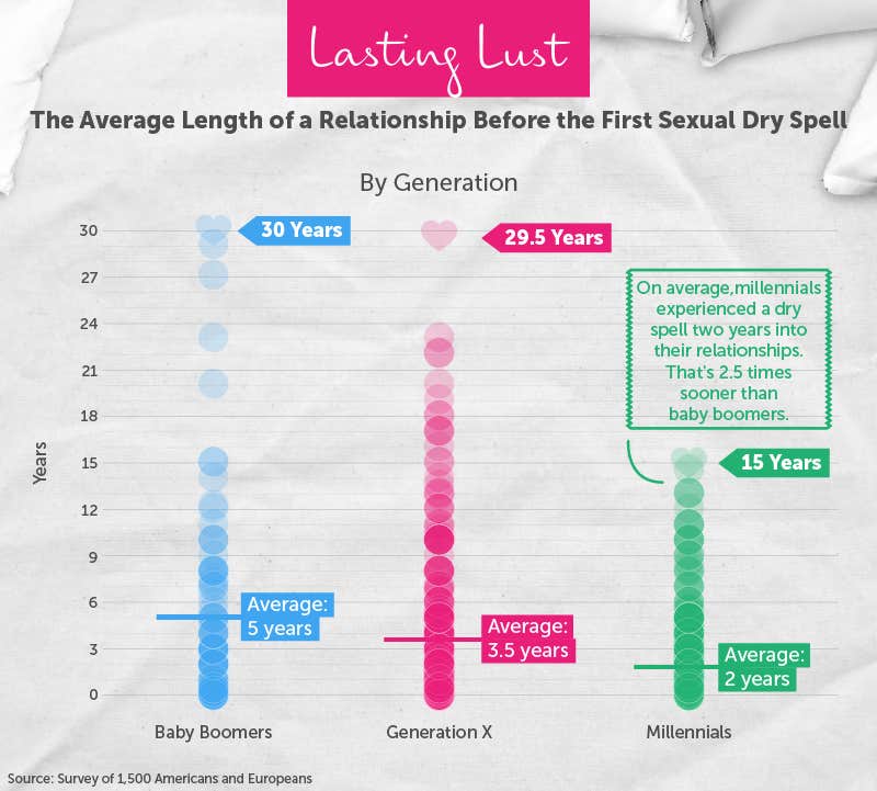 Millennials experienced dry spells about 2.5 times sooner than Baby Boomers, which is about five years. However, GenX-ers identified dry spells occurring on average, 3.5 years into their relationships.