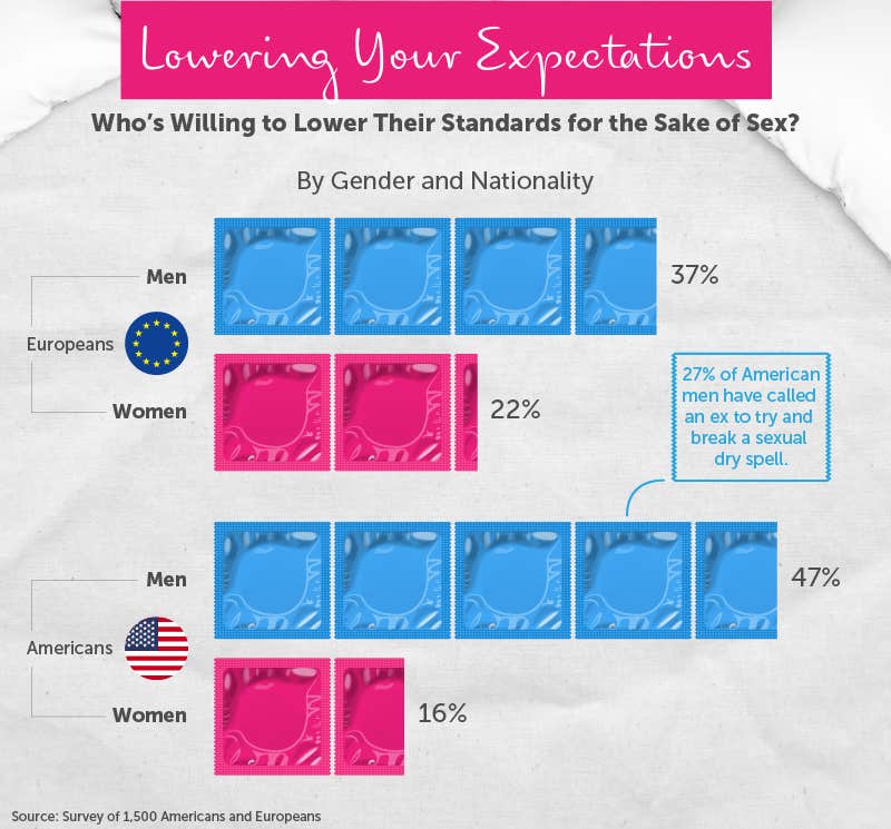 While a sexual dry spell is likely to make people feel down, most American and European women weren’t willing to lower their standards to get a good lay. However, men admitted to being a lot less picky in order to have more sex.