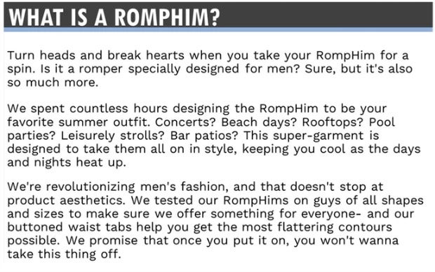 "Turn heads and break hearts when you take your RompHim for a spin. Is it a romper specially designed for men? Sure, but it's also so much more.