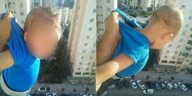 The post, which has since been removed from Facebook, clearly shows the child being held out of the window by only the thin layer of his t-shirt material grasped in the man's hand at an apartment building in the city of Bab Ezzouar, Algeria.