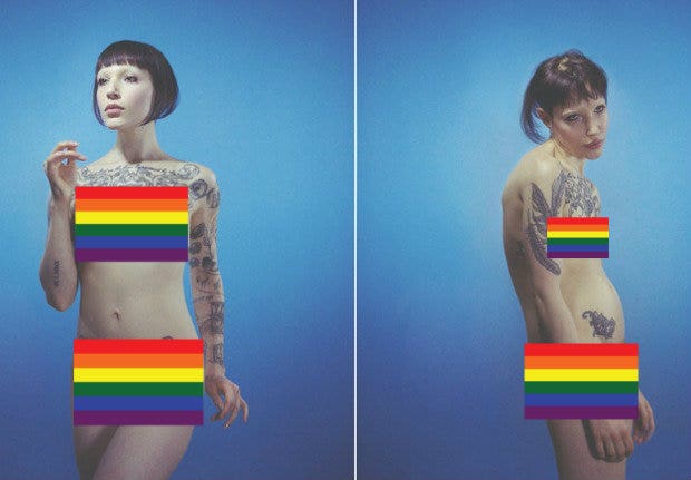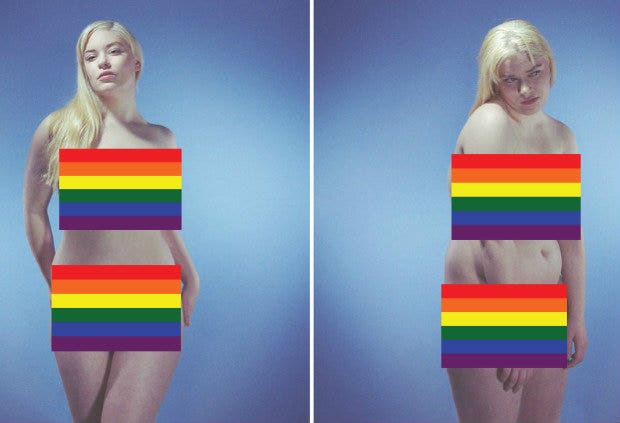 In this series of paired photos, the subject is a naked model in a flattering or confident pose while next to a contrasting picture of the same woman is in an uncomfortable or awkward pose.