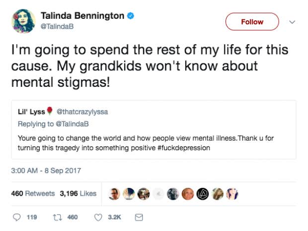 Since his death, Talinda has made it her purpose to bring awareness to depression in hopes to erase the stigma of mental illness, sharing and replying to tweets from fans. According to TMZ, the family is also planning on setting up a suicide awareness organization in hopes of preventing copycat suicides following the deaths of both Bennington and his rocker friend Chris Cornell.