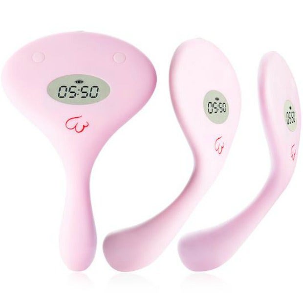 The Little Rooster kind of looks like a tiny pink shovel. There is a long piece (the handle, as it were) which you place between your labia and a flat rectangle (the head... of the shovel part) that presses up flat against your mons pubis. This is where you can see the little digital clock and set it accordingly.