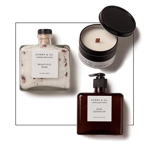 Unwind with this bath soak, paired with a Rose Geranium Hand & Body Wash, and the fragrance of the miniature soy wax Vintage Rose Candle.