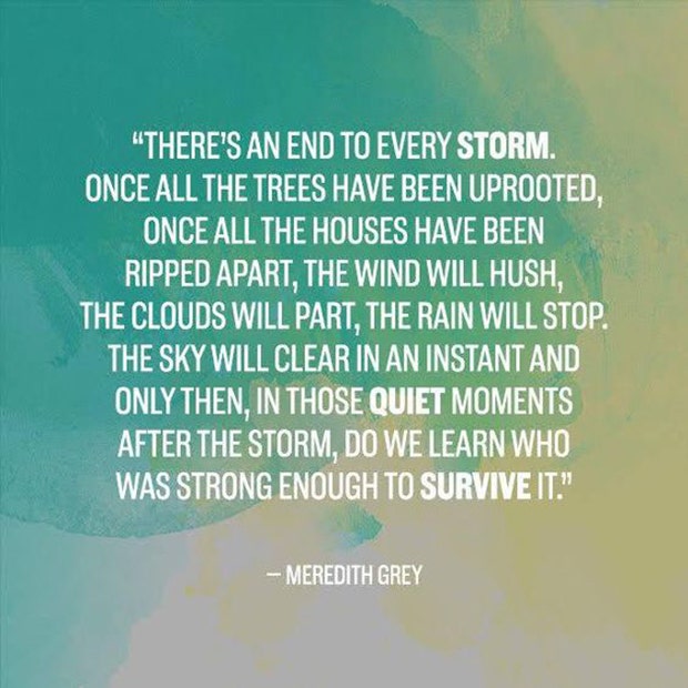 "There's an end to every storm. Once all the trees have been uprooted, once all the houses have been ripped apart, the wind will hush, the clouds will part, the rain will stop, the sky will clear in an instant and only then, in those quiet moments after the storm, do we learn who was strong enough to survive it." — Meredith Grey