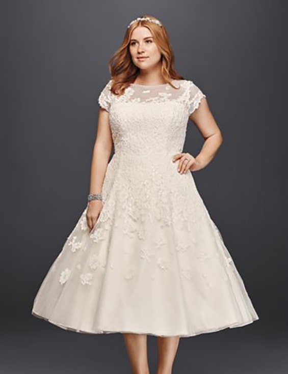 A-line princess cut lace floor length dress. Beautiful and simple from the curvy collection. With the light fabric and lace accents it is perfect for a summertime or springtime wedding!