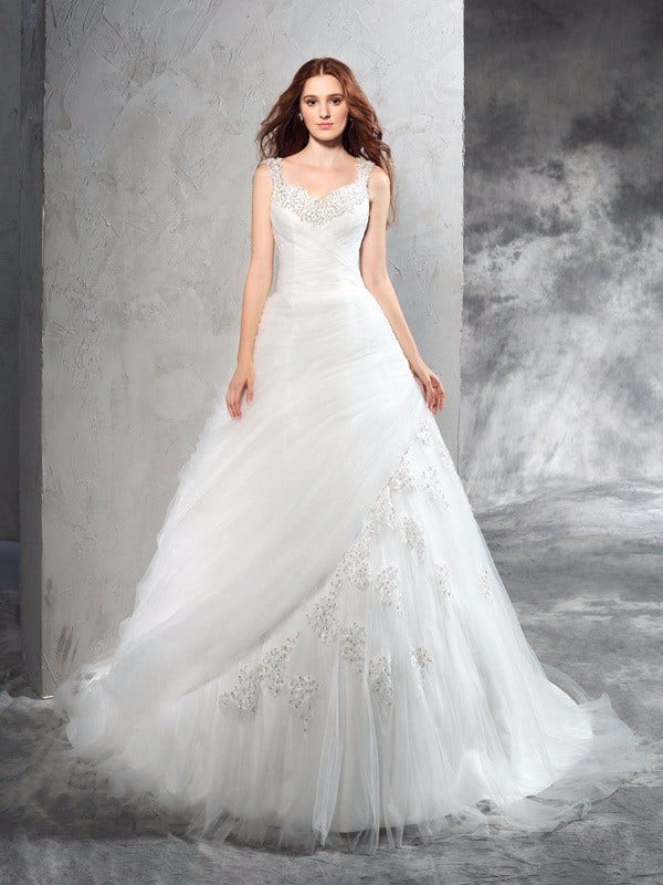 A-line princess straps apolique sleeveless long gown. This dress is one that you will be hesitant to even take off after your wedding. It's gorgeous and different with beautiful detail.