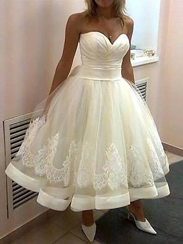 Ball gown sweetheart tulle short wedding dress. If you dont want all the length but want all the pretty this dress is perfect for you!