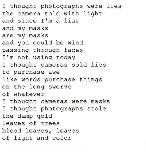 This is a unique poem about the significance of photographs. I do think that in this day and age that people believe photographs are like lies being told. People either don’t look like they do in photos or they don’t show their true feelings.