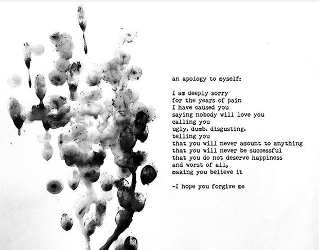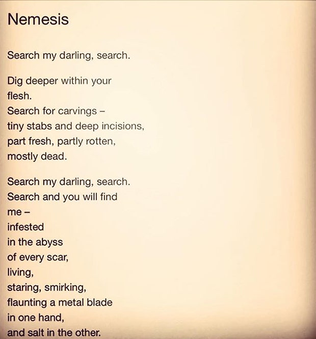 She tackles this issue in her writing bluntly and, by the end of the poem, she hopes to find resolution through the act of forgiving herself. She outlines all of the crimes she’s committed against herself in her dark times.