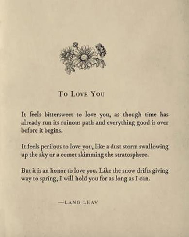 If the name Lang Leav sounds familiar, it’s because it should as she is one of the more well-known poets on this list. This poem is elevated through its elegant vocabulary. It’s as soft and delicate as the flower making it another hybrid poem on this list.
