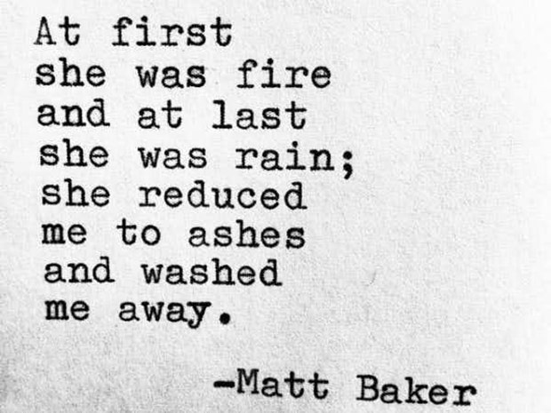 Contrary to the previous poem, this one is more about the aftermath of a powerful relationship. Fire and water are common symbols for the power a loved one has on another person. This poem is unique in that it uses both as opposed to one or the other element. It also shows how a person has the power to become like both elements. Meanwhile, the word placement is intelligently used to create a poetic rhythm.