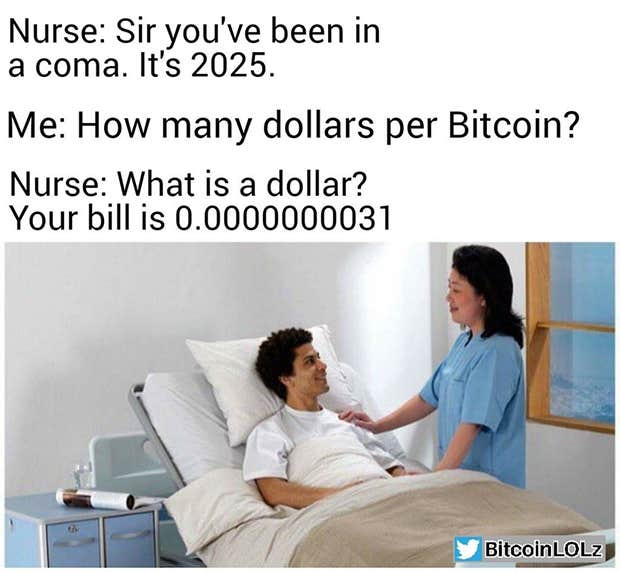 "Nurse: Sir you've been in a coma. It's 2025. Me: How many dollars per Bitcoin? Nurse: What is a dollar? Your bill is 0.0000000031"