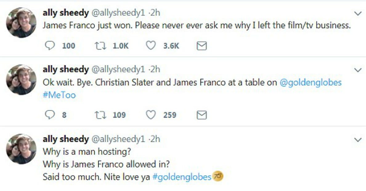“Ok wait. Bye. Christian Slater and James Franco at a table on @goldenglobes #MeToo,” she tweeted, drawing attention to the two and their pasts.