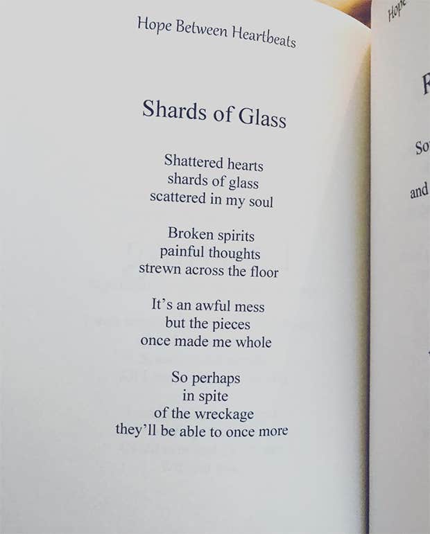 "Shattered hearts, shards of glass, scattered in my soul. Broken spirits, painful thoughts, strewn across the floor. It’s an awful mess, but the pieces once made me whole. So perhaps in spite of the wreckage, they’ll be able to once more.”—Liz Newman
