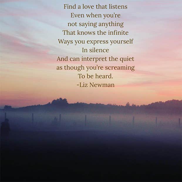 “Find a love that listens even when you’re not saying anything, that knows the infinite ways you express yourself in silence, and can interpret the quiet as though you’re screaming to be heard.”—Liz Newman
