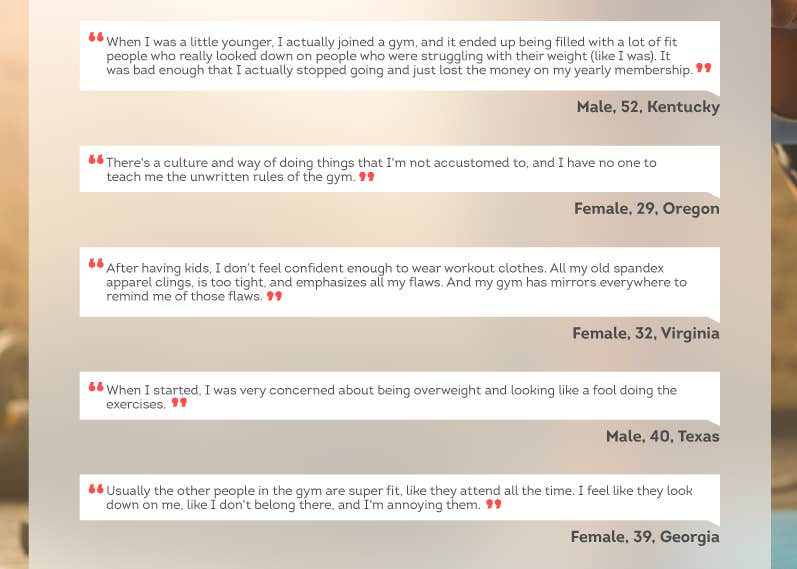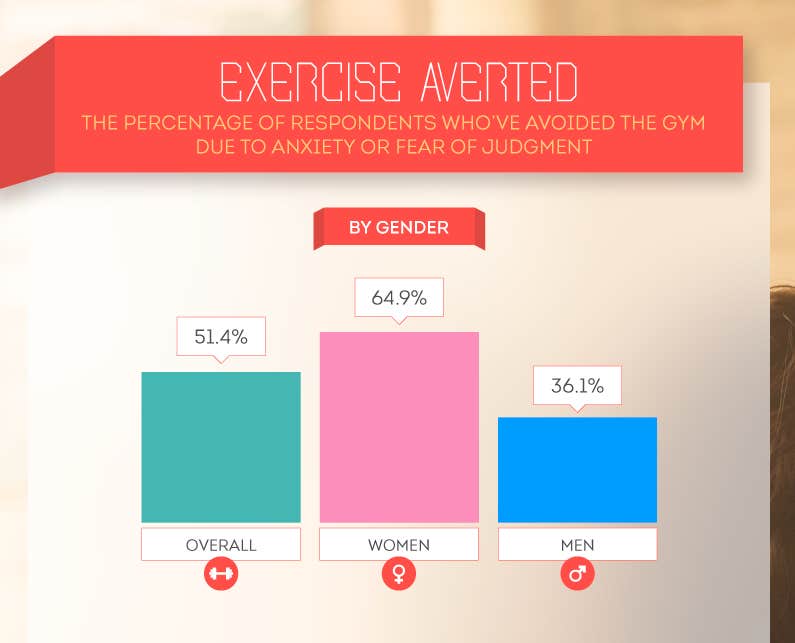 About 36 percent of men feel judged when they go to the gym, whereas about 65 percent of women feel the same way. That's a little bit over half of the people who were surveyed, so this is the more prevalent mentality.