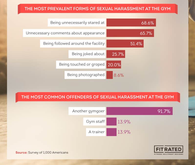 According to the study, nearly 69 percent of people experienced being unnecessarily stared at, while nearly as many received comments about their appearance. Additionally, 1 in 5 people were touched or groped. Let's just put it this way: if someone is working out and in the zone and you think they look hot, just keep it to yourself. They are probably not there just to receive compliments.