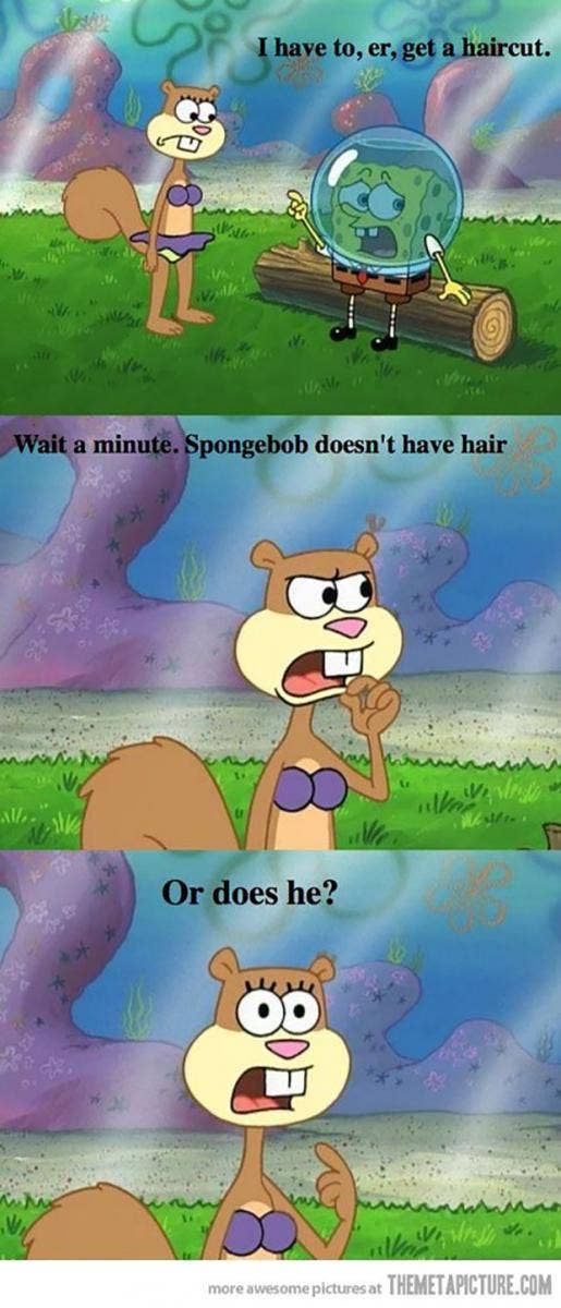 Sandy:“Wait a minute. SpongeBob doesn’t have hair … Or does he?”