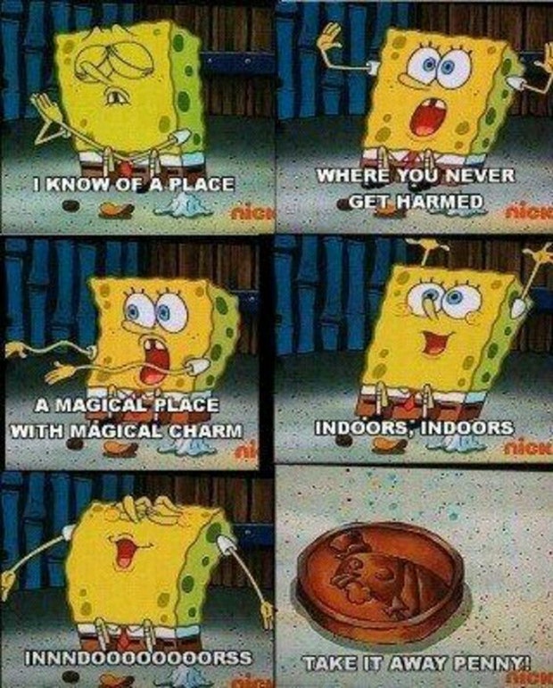 SpongeBob: *singing* “I know of a place where you never get harmed. A magical place with magical charm. Indoors, indoors. Innndooooorss! Take it away, Penny!”