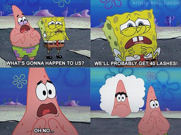 SpongeBob: “What’s going to happen to us? We’ll probably get 40 lashes!”