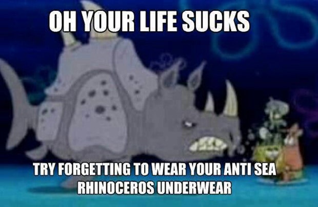 “Oh your life sucks? Try forgetting to wear your anti sea rhinoceros underwear.”