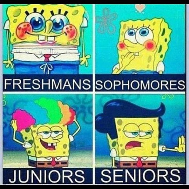 36. When a meme of SpongeBob’s outfits perfectly described the stages of high school and/or college.