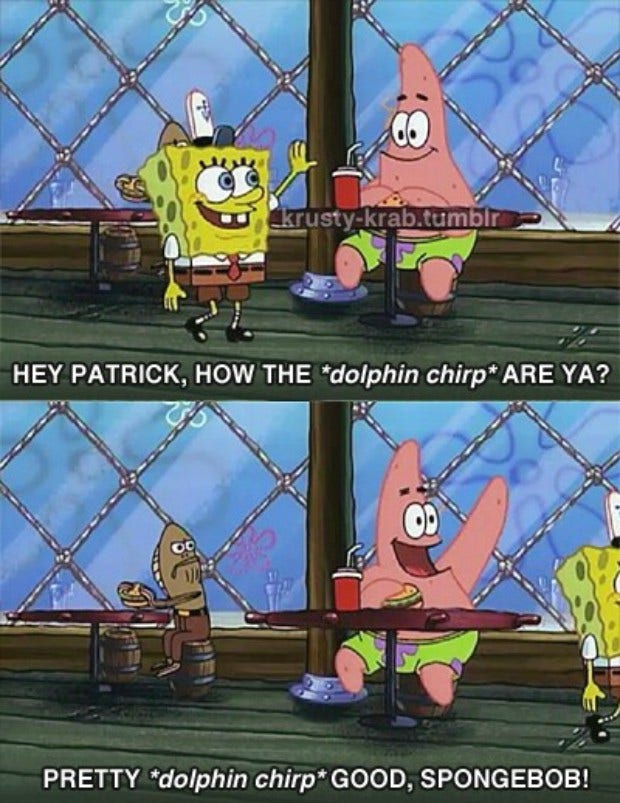 SpongeBob: “Hey Patrick, how the *dolphin chirp* are ya?”