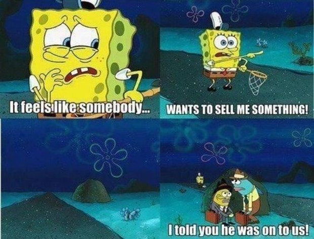 SpongeBob:“It feels like somebody … wants to sell me something!”