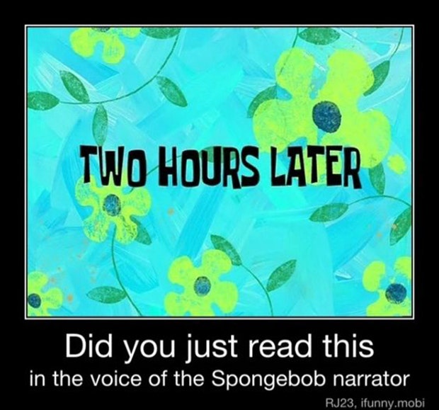 “Two hours later.” (Did you just read this in the voice of the SpongeBob narrator?)
