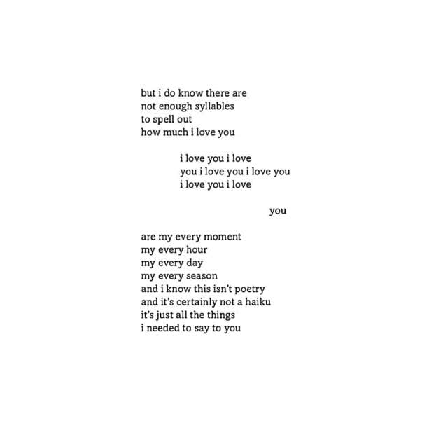 "But I do know there are not enough syllables to spell out how much I love you. I love you I love you I love you I love you I love you I love… You are my every moment, my every hour, my every day, my every season, and I know this isn’t poetry and it’s certainly not a haiku, it’s just all the things I needed to say to you.” – Tyler Kent White